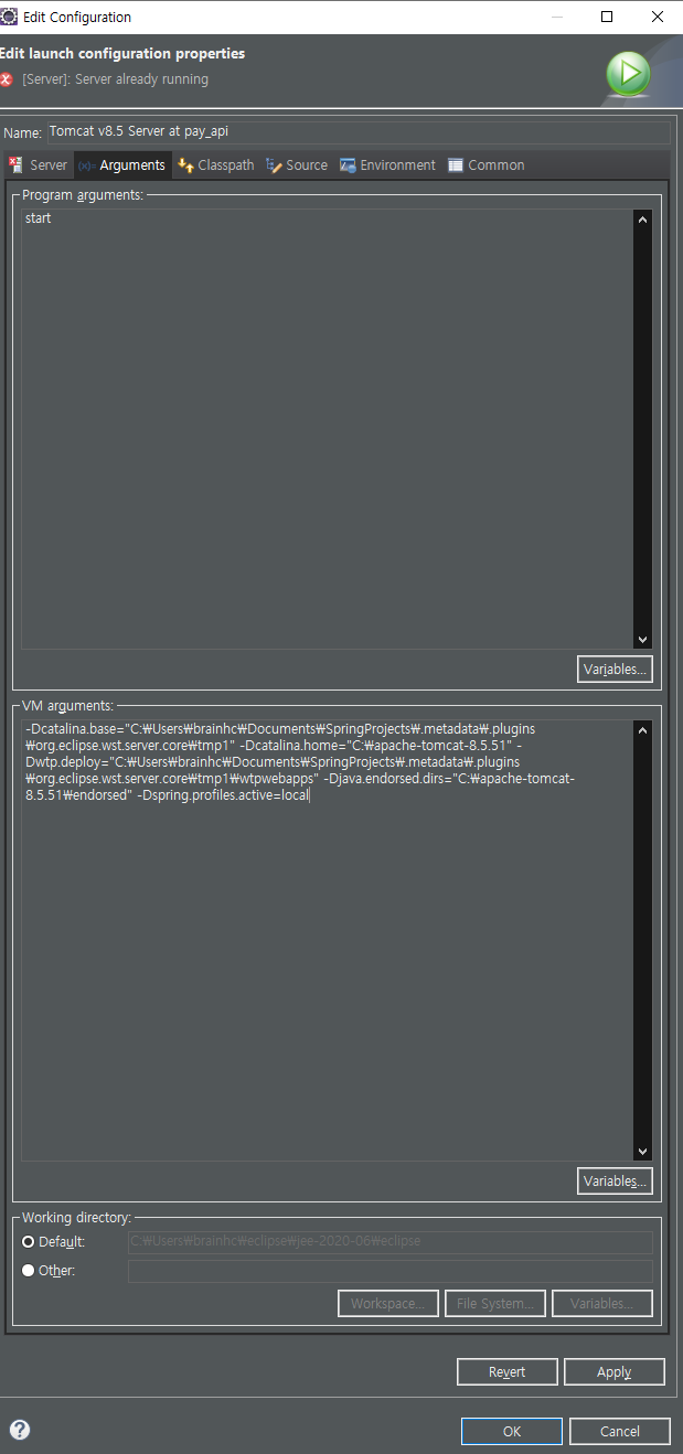 - General Information > Open launch configureation > Arguments 탭 클릭