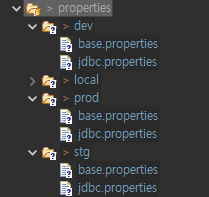 - 이제 아래 폴더명으로 구성된 properties는 환경별로 세팅할 수 있도록 구성 완료